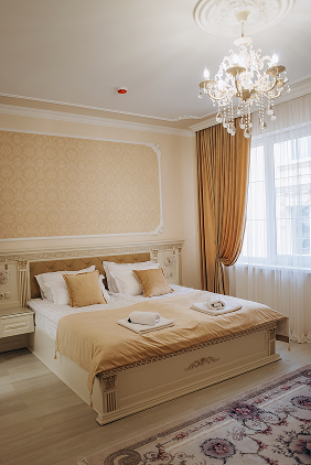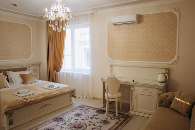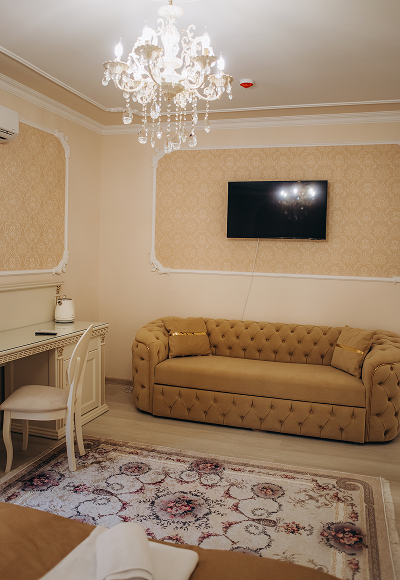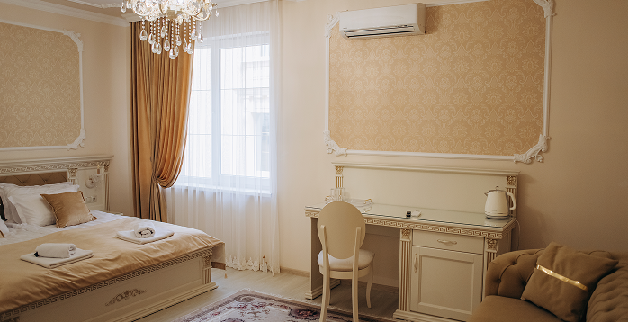 King size ліжко, Розкладний диван, Кавомашина для капсул, Електричний чайник, Сейф, Кондиціонер, Холодильник, Гостьовий куточок, Шафа / Гардероб